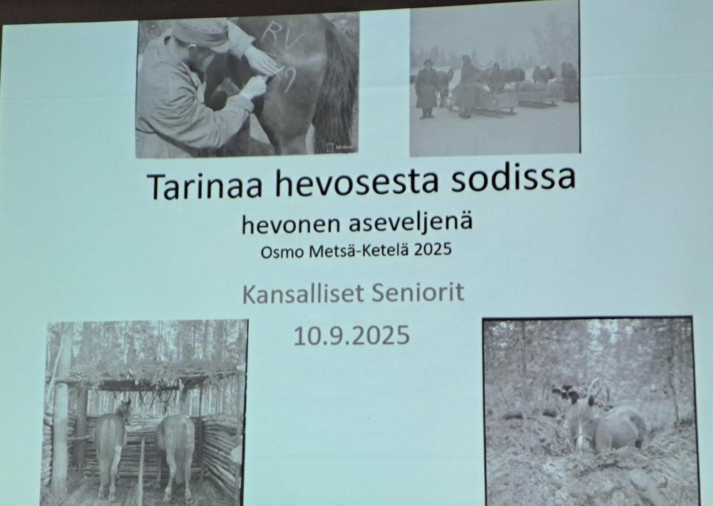 10-9.2025 Kuukausitapaaminen. Tavanomainen syksyn tapaaminen Vilholassa. Vieraana ja alustajana oli Osmo Metsä-Ketelä aiheenaan Suomenhevonan ja hevoset sodassa. Jo ennen Talvisotaa oli koko valtakunnan hevoset pistetty kirjoihin. Kunnissa oli hevosenottolautakunnat ja suunnitelman hevosten käytöstä sota-aikana. Suunnitlmissa oli tiloilla velvoitus ontaa armeijan käyttöön hevonen varusteineen. Armeija korvasi rahalla käytöstä. Suomenhevonen oli tyypiltään sopiva mm. sitkeä ja kestävä maastotyöhön eli kuormanvetoon ym. Talvisodassa oli palveluksessa noin 72000 hevosta ja jatkosodassakinj 62000 . Menetykset olivat talvisodassa n.10 ja jatkosodassa 20 prosenttia . Sodan jälkeen hevoset palasivat siviilityöhön. Suomenhevoselle on pystytetty Seinäjoelle oma patsas. Saimme koko sotahevosasiasta runsaan määrän kaikenlaista tietoa niin, ettei jäänyt enää mitään kysyttävääkään.
