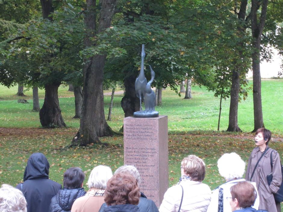 Jussi Mäntysen kurkipatsas vastapäätä päärakennuksen sisäänkäyntiä